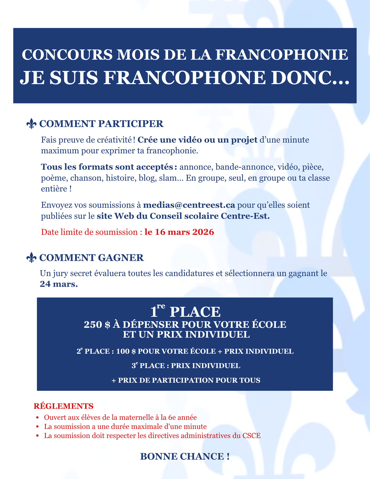 Pour célébrer le Mois de la francophonie, le CSCE a lancé deux concours dans l’ensemble de ses écoles afin de permettre aux élèves de partager, à leur façon, comment ils vivent et célèbrent leur francophonie : un concours pour les élèves du niveau élémentaire et un autre pour le secondaire.