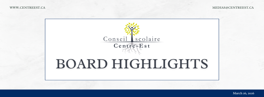 Please see the Board Highlights from the Conseil scolaire Centre-Est Board meeting that was held on March 26, 2026: Board Highlights