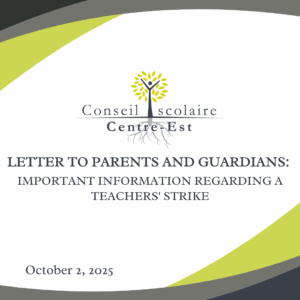 UNE GRÈVE DES ENSEIGNANTS A ÉTÉ DÉCLARÉE PAR L’ATA, À COMPTER DU 6 OCTOBRE. Toutes les écoles et les services de garde pour les élèves M-12 seront fermés jusqu’à ce qu’un accord soit atteint entre l’ATA et le gouvernement. Les programmes prématernelles de 3-4 ans resteront ouverts. Les familles recevront des mises à jour dès qu’elles seront disponibles. Des suggestions de ressources pour les familles ont été envoyées par courriel et sont également disponibles dans la section « Actualité » de notre site web. / A TEACHER STRIKE HAS BEEN INITIATED BY THE ATA, EFFECTIVE OCTOBER 6. All K–12 schools and school care programs will be closed until an agreement between the ATA and the government is reached. 3–4 year-old preschool programs remain open. Families will receive updates as they become available. Suggested resources for families have been emailed and are also available in the News section of our website.